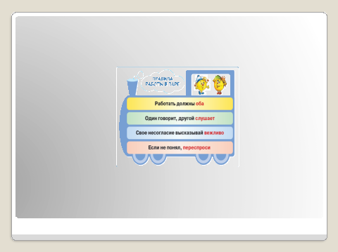 Учитель: Вы будете открывать новые знания в парах. Чтобы ваша работа была результативной, я предлагаю вспомнить правила работы в парах. (You will discover the new material in pairs. For your work to be more resultative let’s remember the rules to work in pairs.)