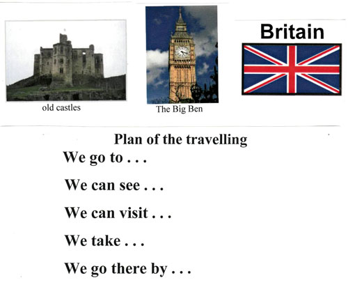 T: Let’s work in groups. Each group has an envelop. You can see a plan of travelling, a list of basic words and some pictures (a flag and sightseeing) there. Complete your plan. Рисунок.2