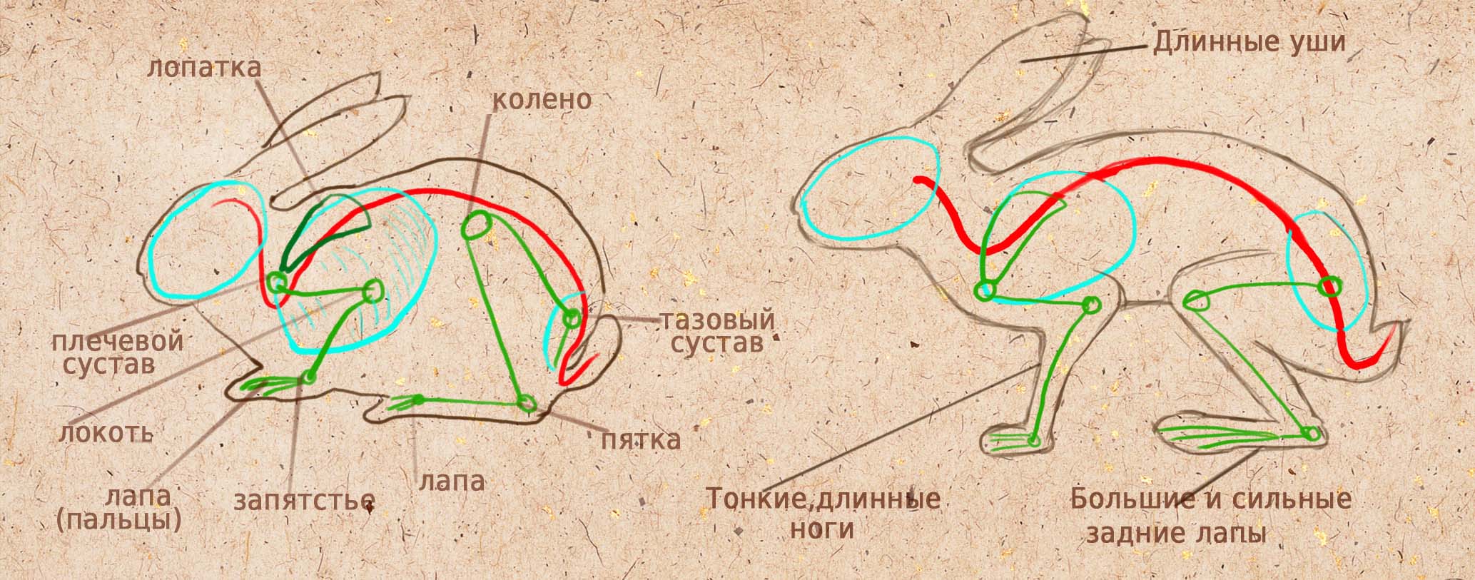 Зайцы и кролики устроены, как и большинство других животных, по тому же принципу, что и человек: голова, грудная клетка, таз (обозначены голубым цветом), все эти части соединены между собой позвоночником (красная линия). Передние ноги имеют небольшую стопу (лапу), задние лапы (часть, которая касается земли) очень большие. Такое строение задних ног помогает этим животным очень быстро бегать.