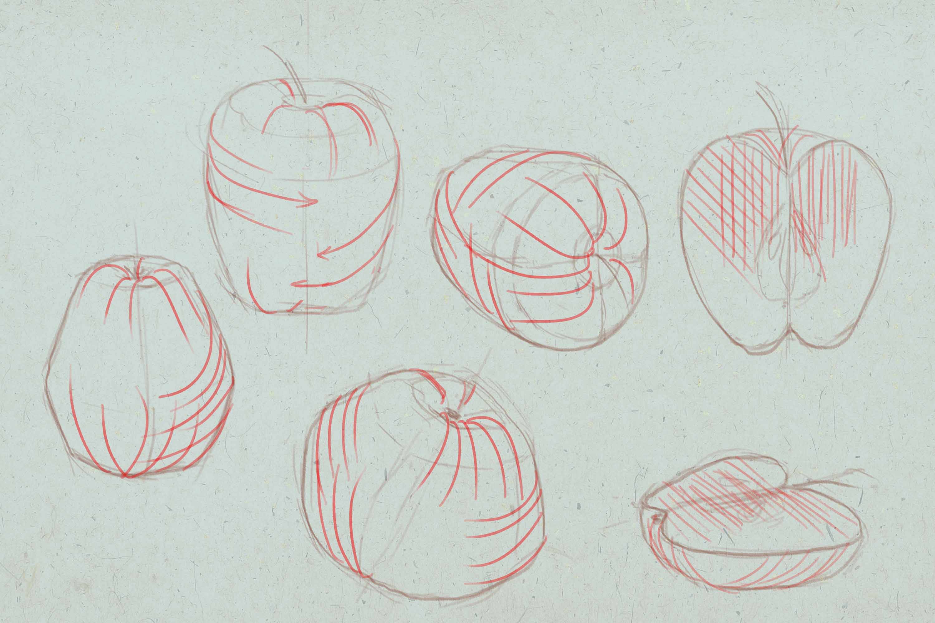 Эти угловатые линии дают нам достаточно четкое представление об объеме фрукта и помогут далее правильно налагать штриховку или мазки красок.