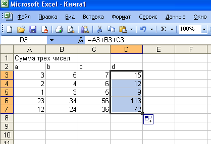 В ячейки A3, B3, C3 заносим любые числа (например, 3, 5, 7).