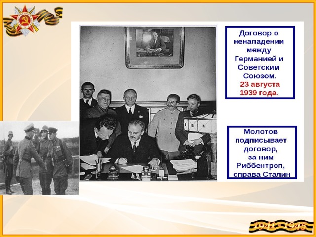 Слайд 8 В конце 1930-х – начале 1940-х гг. отношения между Советским Союзом и Германией выглядели вполне добрососедски: СССР продавал Германии зерно, лён, лес, сырьё для промышленности, военные специалисты государств обменивались опытом, страны заключили пакт (договор) о ненападении… Большинство простых людей было уверено: войны не будет.