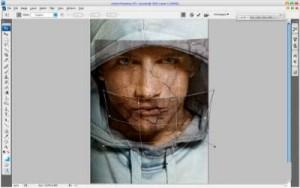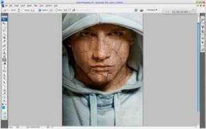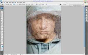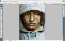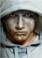 Во-первых, нам необходимо фото человека, чтобы добавить текстуру. Еще нам нужна текстура, например камня или стены (будем использовать для урока изображения из архива). Теперь открываем оба изображения в Photoshop, перемещаем или копируем текстуру в документ открытого фото человека, вы можете оставить текущий размер текстуры или немного уменьшить его, как хотите. После добавления слоя текстуры, фото человека (наш рабочий документ) выглядит так:  Отразим текстуру по вертикали Edit Transform Flip Vertical (Редактировать Трансформация Отразить по вертикали) и уменьшим непрозрачность слоя текстуры до 50%:  Теперь изменим режим слоя и непрозрачность - Blending mode (Режим смешивания) Multiply (Умножение) с непрозрачностью 80%. Затем применяем Edit Transform Warp (Редактировать Трансформация Искривление), чтобы преобразовать текстуру, как на скриншоте ниже:  Эта текстура покрывает лицо, а нам нужно еще добавить текстуру для шеи. Копируем слой текстуры (так же режим смешивания слоя Умножение и непрозрачность 80%) и трансформируем так же, как и первый слой (Edit Transform Warp).  Настало время скомпоновать два слоя текстуры в один для всей кожи (лица и шеи). Скройте видимость верхнего слоя текстуры (щелкните по иконке «глаз» в палитре слое, который указывает видимость слоя) и переходим в нижний слой текстуры. Выберите инструмент Eraser Tool (Ластик) с мягкой круглой кистью около 20 px диаметром и обработайте края текстуры, чтобы получить подобную картинку:  Вернитесь в скрытый слой и включите видимость. Сейчас обрабатываем его края таким же образом  Сливаем два слоя текстур в один (в палитре слоев выделяем эти слои и идем Layer Merge layers (Слой / Объединить слои) или нажимаем Ctrl+E) и меняем режим объединенного слоя снова на Multiply. Теперь вы можете добавить резкости слою текстуры, используя инструмент Sharpen Tool (R) (в палитре инструментов, где Капля и Палец) c мягкой круглой кистью около 400 px:  Затем необходимо очистить область глаз от текстуры, используя мягкий ластик диаметром 10 px:  Пришло время добавить объем текстуре. Этот эффект создадим инструментами Dodge Tool (Осветление) (Range (диапазон): Highlights (светлые тона), Exposure (воздействие): 35%) и Burn Tool (Затемнение) (Range: Shadows (темные тона), Exposure: 40%). Обработаем часть текстуры в области лица и шеи осветляя, а другие области затемняя. Постарайтесь сделать изображение более реалистичным.  Затем добавить резкости слою с человеком, используя инструмент Sharpen Tool (Size: 90px, Mode: Normal, Strength: 50%), и обработать некоторые области одежды:  Хорошо выглядит или не очень? Но мы еще не закончили! Настало время добавить цвет коже. Используя любой инструмент выделения: Lasso (Лассо) или Pen (Перо), создаем выделение, как на картинке ниже. Затем создаем новый слой и, с всё еще загруженным выделением, заливаем область коричневым цветом:  Снимите выделение, нажав Ctrl+D, и измените режим смешивания этого слоя на Color (Цвет):  После создания нового цвета кожи, можно добавить холодный оттенок его лицу. Для этого эффекта выбираем инструмент Rectangular Marquee Tool (Прямоугольное выделение), устанавливаем в опциях инструмента Feather (растушевка): 100 px и создаем выделение, как показано ниже:  Затем используем Image Adjustments Hue/Saturation (Изображение Регулировка Оттенок/Насыщенность) с подобными настройками:  Снимаем выделение (Ctrl+D). Сейчас мы имеем эффект подобно этому:  Заключительный штрих: выбираем инструмент Ластик с мягкой круглой кистью и размером 