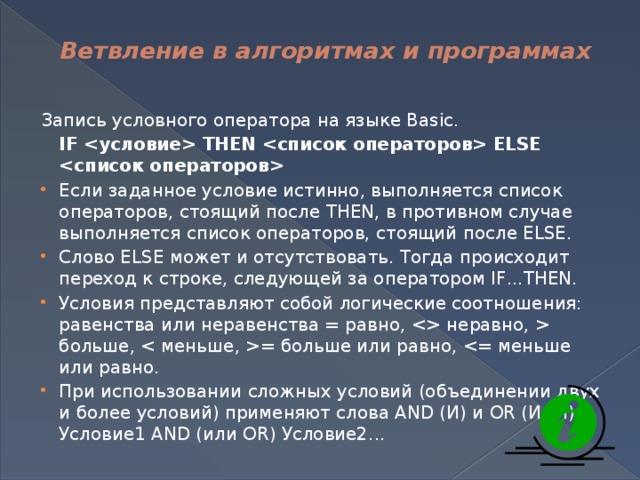 - Если заданное условие истинно, выполняется список операторов, стоящий после THEN, в противном случае выполняется список операторов, стоящий после ELSE.