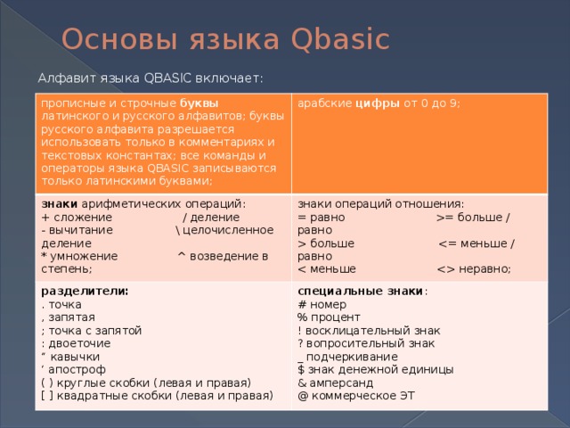 прописные и строчные буквы латинского и русского алфавитов; буквы русского алфавита разрешается использовать только в комментариях и текстовых константах; все команды и операторы языка QBASIC записываются только латинскими буквами;
