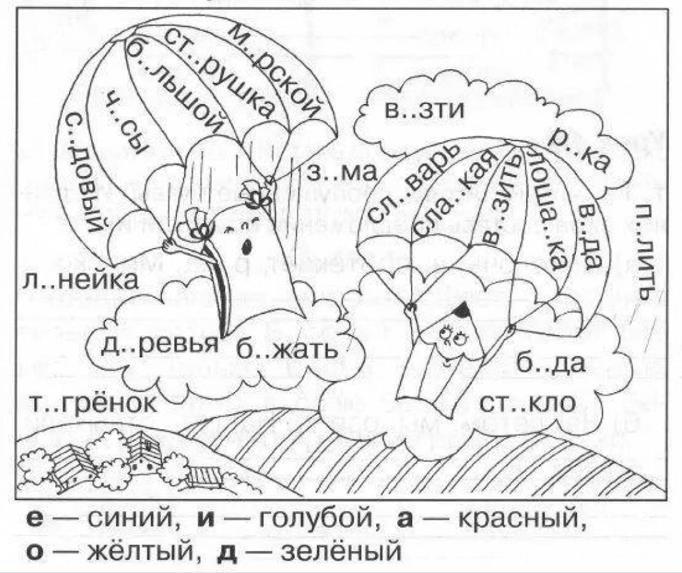 | Обобщение и систематизация знаний 5-7 минут | А для задания, которое я приготовила вам напоследок, вам понадобятся цветные карандаши\ручки\ фломастеры, это может быть все, что вашей душе угодно. Перед вами картинка, которую вам требуется раскрасить. Вот только раскрасить не так, как вам бы этого хотелось. На каждой детали, которую нужно закрасить, написано слово в безударной гласной в корне. Буква, которую необходимо вставить на место пропуска, соответствует определенному подписанному цвету. Так что для того, чтобы раскрасить картинку полностью, вам потребуется заполнить все пропуски. Можете приступать, время на выполнение этого задания у вас почти до конца занятия. Далее я выведу Раскрашенную картинку на доску и вам нужно будет проверить себя. ошибка-5 ошибки-4 ошибки-3 иболееошибок-2 Ребята поднимите руку, укого0или1 ошибка. -Вы большие молодцы. | Дети выполняют задание, ни у кого нет ошибок. | и |