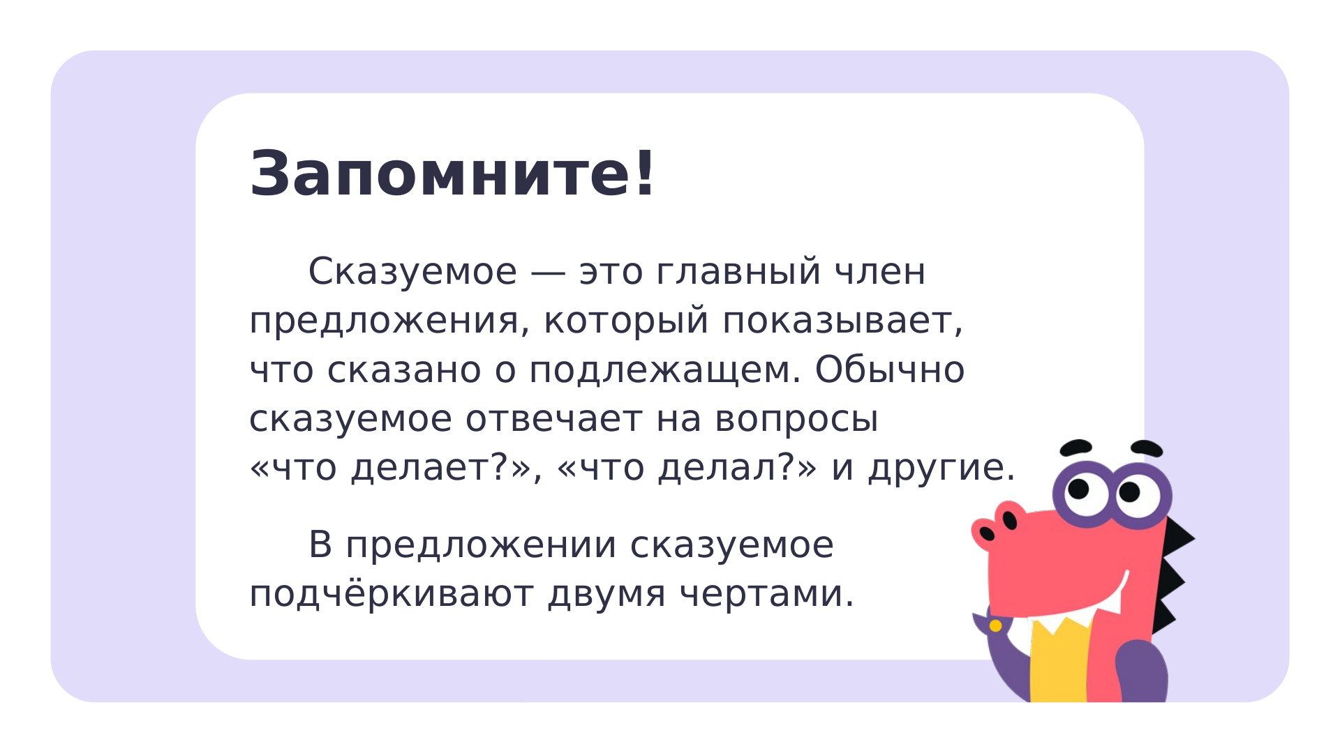 | Открытие нового знания — Найдите в кластере информацию о сказуемом — Какую роль играет сказуемое в предложении? (Это главный член предложения, который связан с подлежащим и называет его действие.) — На какие вопросы чаще всего отвечает сказуемое? (Что делает? Что сделает? и т.д.) — Как сказуемое подчёркивается в предложении? (Двумя чертами.) | |