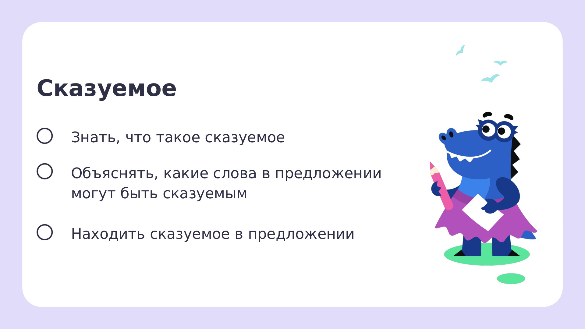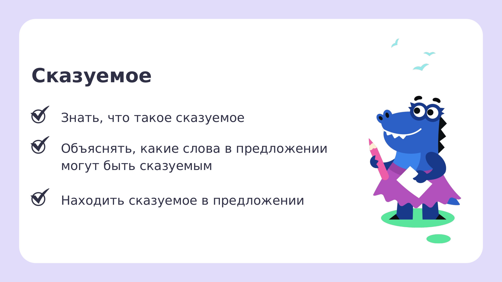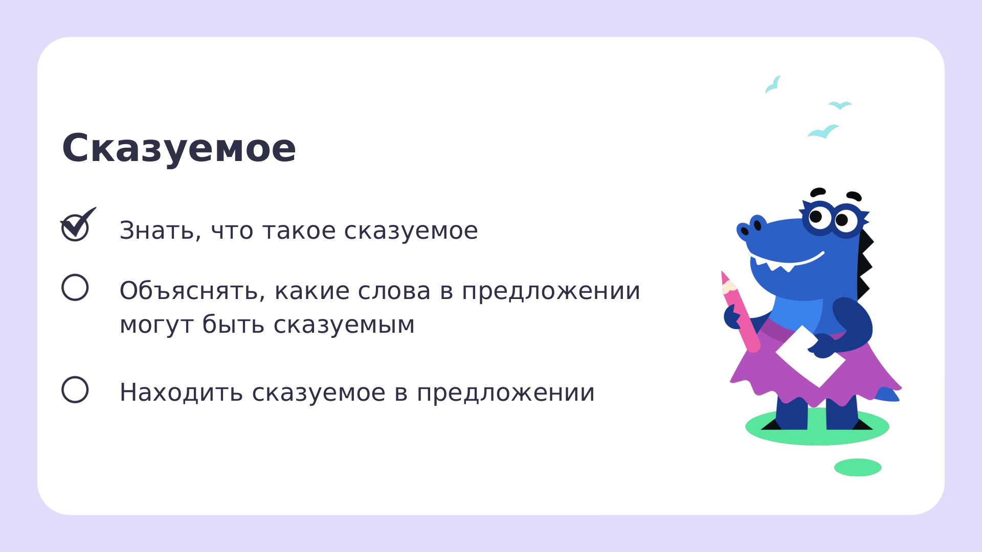 | Сверяемся с целями — Давайте проверим, удалось ли нам достигнуть первой цели? — Что такое сказуемое? Как оно связано с подлежащим? На какие вопросы обычно отвечает сказуемое? — Как вы думаете, на какие ещё вопросы может отвечать сказуемое? | |