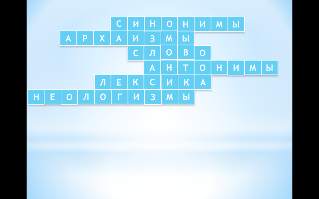 | 2. Актуализация знаний (4 минуты) 3. Постановка учебной задачи. (1минута) | - Ребята, сегодня мы с вами отправимся в путешествие в некоторое царство, в некоторое государство, а в какое именно, вы вскоре узнаете. - Послушайте, как все начиналось. Жили-были Иван-Царевич и Елена-Прекрасная. Однажды гуляли они в роще, и вдруг налетел вихрь и унес Елену. Опечалился Иван-царевич, упал на землю и залился горючими слезами. А березка над ним шелестит: «Не плачь, добрый молодец! Найдешь ты Елену-Прекрасную у Кащея Бессмертного в невиданном царстве» (Слайды 4,5). - Итак, отправился Иван-Царевич в далекий путь. Ребята, поможем нашему герою вернуть Елену-Прекрасную? - Долго ли, коротко ли шел он, и на пути встретилась река, а моста нет. Только веревка с одного берега на другой протянута, а на веревке той задание, выполнив которое Иван-Царевич узнает название того царства невиданного, переберётся на противоположный берег. Сейчас мы проверим, весь ли багаж вы собрали в путь. Задание 1 - Разгадайте кроссворд по теме «Лексика» (Слайды 6). 1. Слова, близкие по лексическому значению. 2. Устаревшие слова. 3. Основная единица языка. 4. Слова, противоположные по значению. 5. Словарный состав языка. 6. Новые слова. - Какое же ключевое слово получилось? - Итак, как звучит тема нашего сегодняшнего урока? Добро пожаловать в лексическое царство омонимов! (Слайд 7) - Откройте тетради, запишите число. Классная работа. Тему урока. - Мы продолжаем знакомиться с основными понятиями раздела «Лексика». - Исходя из темы урока, сформулируйте его главную цель. Что сегодня предстоит нам выяснить? - Правильно, в конце этого урока мы должны уметь находить и различать омонимы в тексте, находить их в тексте, отличать омонимы и многозначные слова, уметь использовать омонимы в речи, а также наш словарный состав должен пополниться. (Слайд 8). | Учащиеся разгадывают кроссворд. - Синонимы. - Архаизмы. - Слово. - Антонимы. - Лексика. - Неологизмы. - Омонимы. - Омонимы. Запись учащимися числа, «Классная работа», темы урока. - Цель урока - понять, какие слова являются омонимами. | Принцип деятельности. УУД: регулятивные (проблемная подача учебного материала). Практика опережающего обучения. Принцип целостности. УУД: познавательные, регулятивные (самостоятельное формулирование цели и задач, планирование, прогнозирование) ЦЕЛЬ: создать проблемную ситуацию, спрогнозировать предстоящую деятельность. |