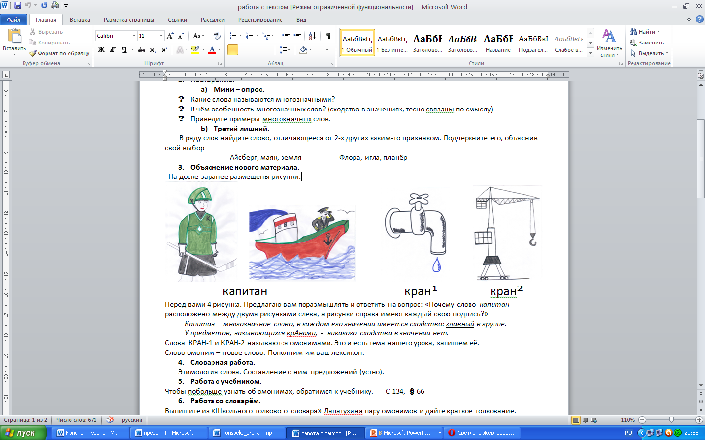 Усвоение новых знаний. 4 минуты Первичное закрепление знаний. 7 минут 2 минуты 2 минуты Физ. минутка (пауза релаксации) 1 минута 10 минут | I. Формирование понятия «омонимы», отличие омонимов от многозначных слов. (Встреча с лесными зверюшками). - Возвращаемся в наше царство омонимов. Итак, ребята, с вашей помощью Иван-Царевич благополучно миновал реку. А за ней – лес. На лесной тропинке увидел Иван двух одинаковых с лица инопланетных зверушек и услышал их разговор: - Это чужой, скорее принеси лук. Неизвестно ещё, зачем он оказался в нашем царстве. - Хорошо, я мигом. - Что ты мне принёс? - Я принёс тебе лук. Ты же просил лук! - Лук, лук… Я просил тебя принести лук со стрелами, а не луковицу с огорода. Всё, мы пропали: он направляется сюда (Слайд 9). - Иван – Царевич не обидел зверюшек, а выяснил, что они попали в царство за то, что до сих пор не научились жить по его законам, что будут находиться здесь, пока не овладеют всеми необходимыми знаниями. Давайте поможем зверюшкам? Как вы считаете, почему они не поняли друг друга в диалоге? - Так что же такое «омонимы» (Слайд 10)? - Термин этот введён Аристотелем - древнегреческим философом; он был воспитателем полководца А. Македонского. - Откройте, пожалуйста, свои справочники по русскому языку и запишите определение и примеры. - Кто готов еще раз озвучить определение по памяти? Задание 2. - Выразительно прочитайте стихотворение Александра Шибаева и определите, есть ли в этом тексте омонимы. (Слайд 11). Норка вылезла из норки И пошла к знакомой норке. В нору норкину вошла, Норку в норке не нашла. Если норки нету в норке Может, норка возле норки? Нет нигде. Пропал и след. Норка-здесь, А норки нет! - О чём это стихотворение? - Назовите слова-омонимы. - Определите лексическое значение этих слов? - Какая книга помогает нам в определении лексического значения слова? *Норка - хищное млекопитающее; норка (от «нора») - временное или постоянное убежище, создаваемое животными в почве. -Запишите эти слова и сделайте морфемный и словообразовательный разбор каждого слова. норка (животное) - норки норка норковая (суффиксальный способ словообразования) норка (убежище) – норки норка нора (суффиксальный способ словообразования) Проверка разборов слов. - Какой способ словообразования у обоих слов мы определили? - С точки зрения этимологии слово «нора» общеславянское, от nerti - «скрываться, погружаться». Было такое выражение «понерети», т.е. «опуститься», «скрыться». А слово «норка» заимствовано из финского языка- «nirk» - «горностай». Сближение с «нора» является вторичным, и обязано своим пользованием народной этимологии, поэтому мы с уверенностью можем сказать, что даже по происхождению эти слова различные по лексическому значению и употреблялись изначально в разных языковых группах (Слайд 12). - Какой сделаем вывод? Наводящие вопросы: 1.Какой частью речи эти слова являются? 2.Одинаковы ли они по написанию и произношению? 3.Как они образованы по морфемному составу? 4. А каковы по происхождению? - Значит, перед нами омонимы. Задание 3. - Вернёмся к этимологии слов «норка» и «нора». Сколько лексических значений имеет слово «нора»? - Как называются слова, имеющие несколько лексических значений? - Перед вами 4 рисунка. Ответьте на вопрос -почему слово «капитан» расположено между двумя рисунками, т.е. каждый рисунок имеет одно название, а рисунки снизу имеют каж