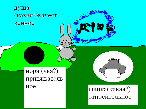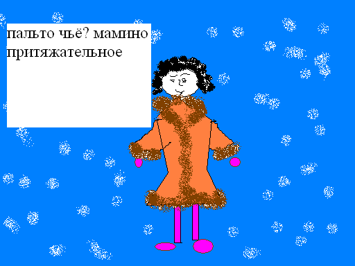 | | Индивидуальные задания «Определите разряды прилагательных» НАРИСУЙТЕ В ГРАФИЧЕСКОМ РЕДАКТОРЕ ОДНО СЛОВОСОЧЕТАНИЕ. Волчий аппетит, беличий хвост, медвежья шуба, кирпичный дом. Интересная книга, кроличьи следы, каменная стена, белый снег. Московские улицы, бабушкин платок, мамино пальто, золотые руки. Большое яблоко, лисья нора, детские игрушки, теплые рукавицы. Творческое задание (Выполняется по желанию учащихся) Придумайте свое словосочетание и изобразите его с помощью графического редактора Pain. | Каждый ученик по своему выбору определяет, какие словосочетания он будет рисовать. Результаты в приложении |