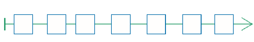 Понятия начала и конца цепочки мы скоро перестанем использовать. Обычно мы будем говорить о первой, второй, ..., последней бусине цепочки. Однако в наглядном представлении понятия начала и конца полезны. Обратите внимание, как обозначены начало и конец цепочки: начало - это прямая палочка, перпендикулярная оси цепочки, а конец - стрелка. Начало и конец при таком понимании соотносятся с началом и концом «нанизывания» элементов цепочки на нить, где стрелка символизирует иголку, а палочка - узелок.