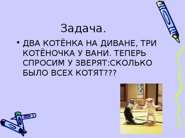Два котёнка на диване, три котёночка у Вани. Теперь спросим у зверят: сколько было всех котят???