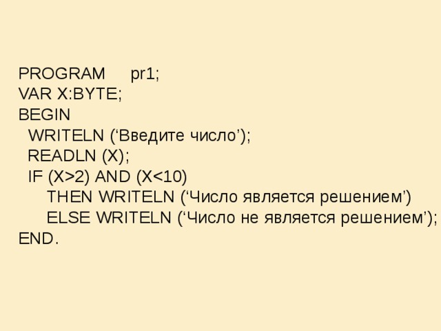 2) AND ( X THEN WRITELN (‘Число является решением’) ELSE WRITELN (‘Число не является решением’); END . " width="640"