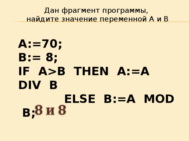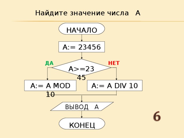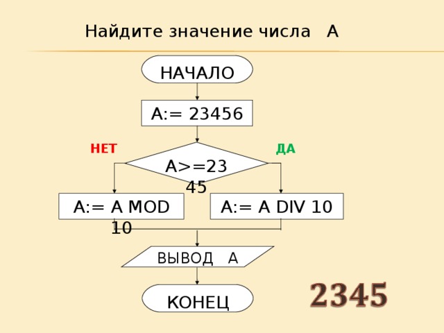 =2345 А:= A DIV 10 А:= A MOD 10 ВЫВОД А КОНЕЦ " width="640"
