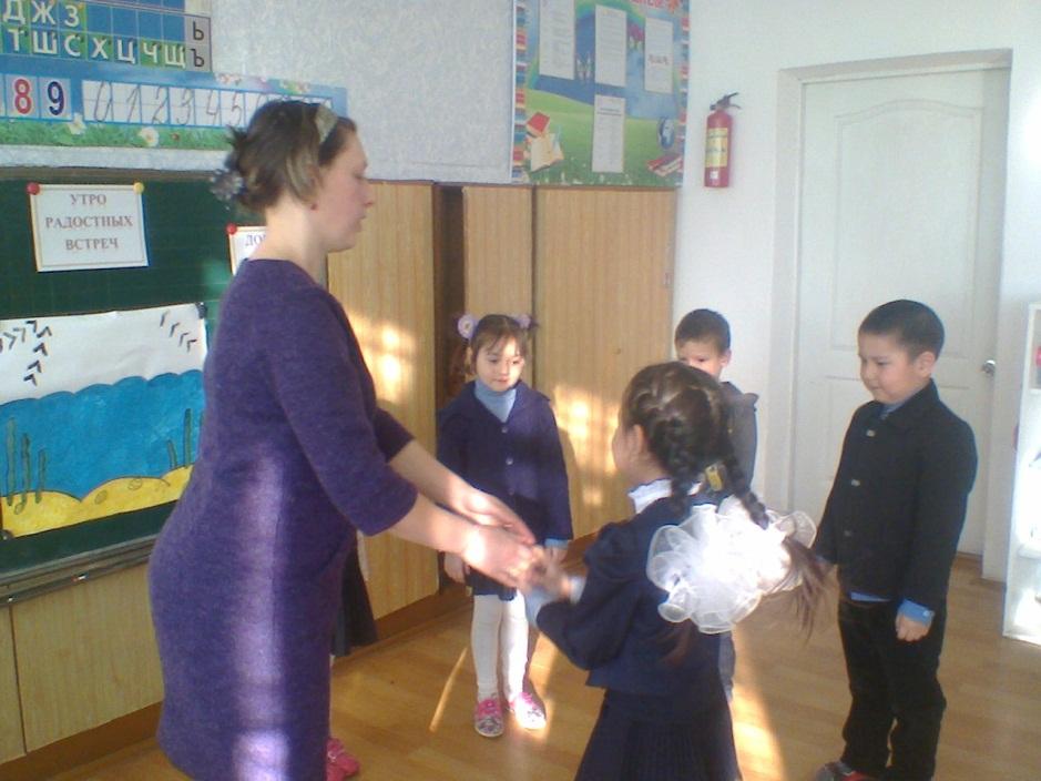 | Мотивационно- побудительный | Позитивный настрой Добрый день, ребята! Сегодня у нас с вами интересная тема под названием: «Утро радостных встреч» Цитата урока: Если вы хотите, чтобы жизнь улыбалась вам, подарите ей сначала свое хорошее настроение. Первые слова, которыми мы начинаем день, – это «доброе утро». Что мы хотим этим сказать? Просто пожелать доброго утра? А может быть, хотим, чтобы нынешним утром все были добрыми? Как вы думаете, ребята? Как можно выразить свое доброе отношение к другому человеку? «Здравствуйте», «привет», «доброе утро», «добрый день», «добрый вечер», «рад тебя видеть», «добро пожаловать», «как поживаете». | Настраиваются на урок Отвечают на вопросы |