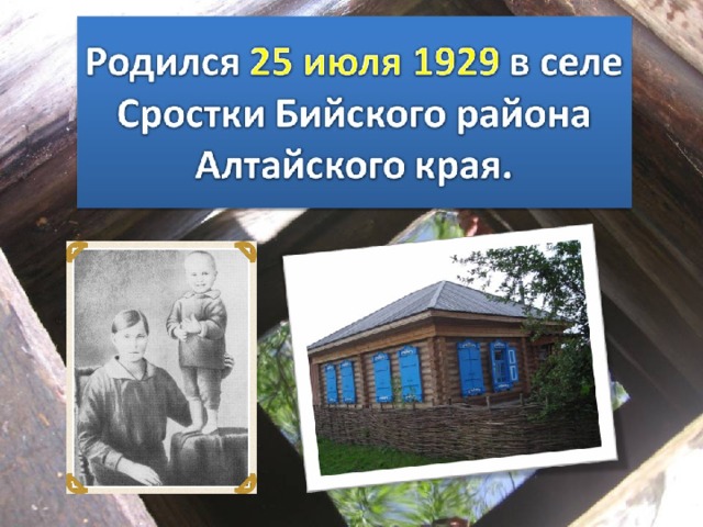 1943 — окончил сельскую семилетнюю школу в Сростках. Поступил в Бийский автомобильный техникум , который не закончил.