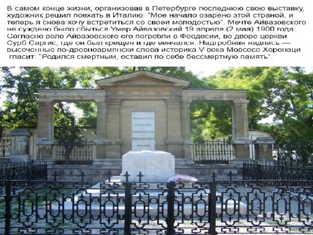 В 1840 году Айвазовский уехал в Италию. Там он сблизился с яркими деятелями русской литературы, искусства, науки - Гоголем, Александром Ивановым, Боткиным, Панаевым. Одновременно расширился круг его армянских знакомств .