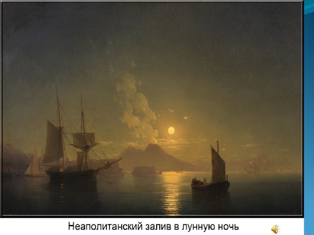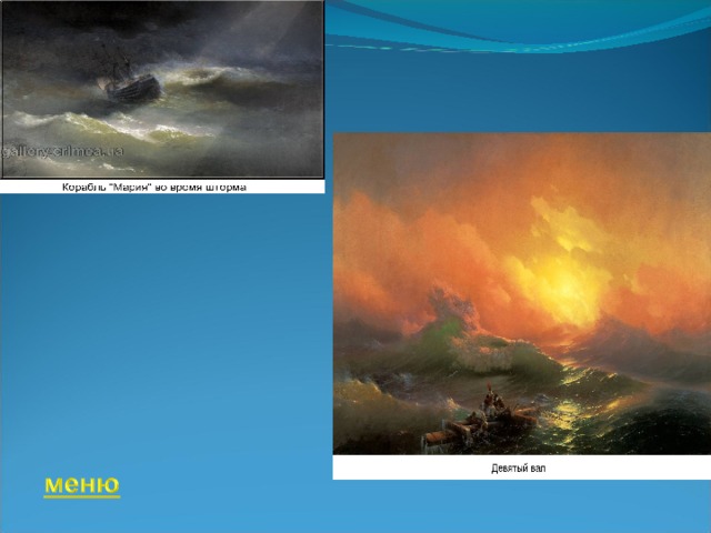 Творчество Айвазовского своего рода морская энциклопедия. Из нее можно в деталях узнать о любом состоянии, в каком пребывает водная стихия — штиль, легкое волнение, шторм, буря, производящая впечатление вселенской катастрофы. В его работах можно увидеть море в любую пору суток — от светозарных восходов до лунных ночей; и в любое время года насчитать десятки оттенков, окрашивающих морские волны — от прозрачных, почти бесцветных через все мыслимые нюансы голубизны, синевы, лазури до густой черноты. В 1873 году Айвазовский создал выдающуюся картину “Радуга”. В сюжете этой картины — буря на море и корабль, гибнущий у скалистого берега, — нет ничего необычного для творчества Айвазовского. Но ее красочная гамма, живописное выполнение были явлением совершенно новым в русской живописи семидесятых годов.