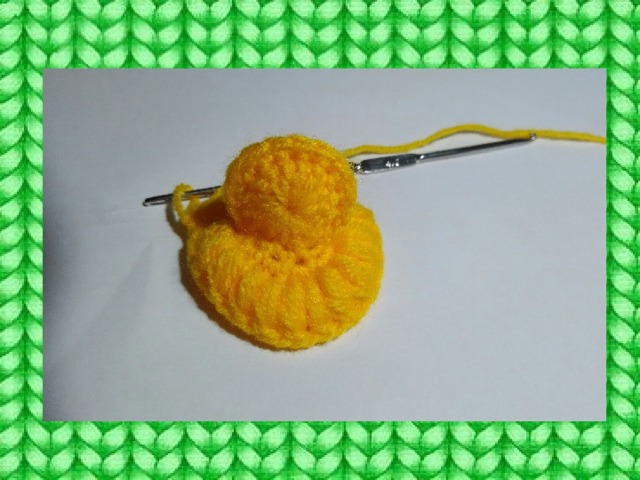 - Пышный столбик –п.ст. (сделайте накид, введите крючок в петлю основания и вытяните длинную петлю. Далее опять делаем накид, вводим крючок в ту же петлю и снова вытягиваем нить, так делаем 3 раза, а на 4 раз - делаем накид, вводим крючок в петлю, вытягиваем и провязываем все петли, оставшиеся на крючке, чтобы получилась общая верхушка )