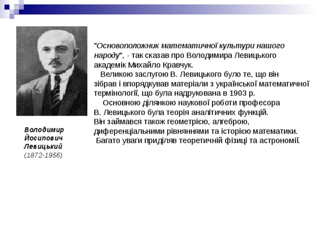 академік Михайло Кравчук. Великою заслугою В. Левицького було те, що він