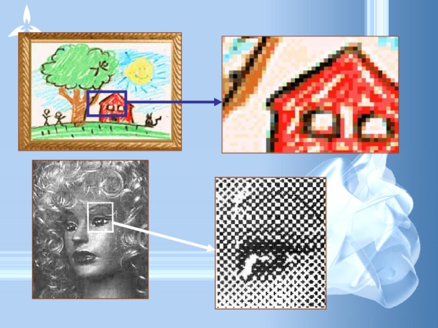 Растрові зображення складаються з крапок (пикселів) – кольорових квадратиків одинакового розміру. Растрове зображення як мозаіка - коли збільшуєте його, то бачите окремі пикселі, а зменшуєте, пикселі зливаються.