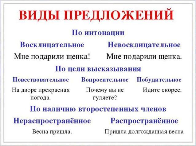 По цели высказывания предложения бывают повествовательными (содержит сообщение, на конце – точка, многоточие, восклицательный знак), вопросительными (содержит вопрос, на конце – вопросительный знак) и побудительными (содержит побуждение, на конце – точка, восклицательный знак). По интонации предложения бывают восклицательными (с особой восклицательной интонацией, на конце – восклицательный знак) и невосклицательными (без восклицательной интонации, на конце – остальные знаки).