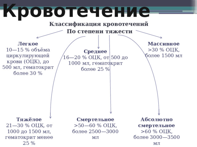 30 % ОЦК, более 1500 мл 10—15 % объёма циркулирующей крови (ОЦК), до 500 мл, гематокрит более 30 % Среднее 16—20 % ОЦК, от 500 до 1000 мл, гематокрит более 25 % Тяжёлое Смертельное Абсолютно смертельное 60 % ОЦК, более 3000—3500 мл 50—60 % ОЦК, более 2500—3000 мл 21—30 % ОЦК, от 1000 до 1500 мл, гематокрит менее 25 % " width="640"