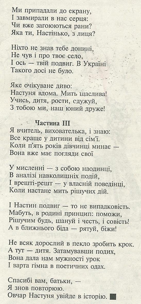 Мати Україно! Берегине долі народної! Це ти в часи лихоліть підносила дух дітей своїх, сповнюючи їх гордістю і повагою. Це твої згорьовані очі йшли за нами всіма великотрудними дорогами, не давали забути, хто ми є, чиї ми діти.