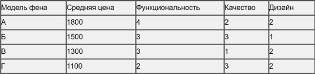 В таблице даны цены и показатели четырёх моделей фенов.