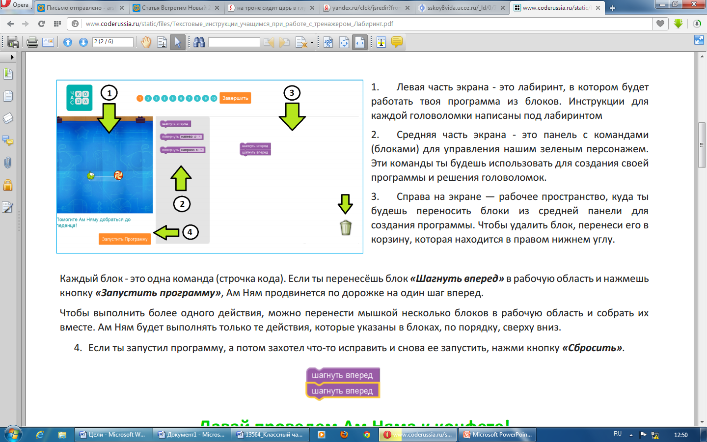 Цель нашей первой программы - помочь персонажу игрового приложения, Ам Няму, добраться до леденца. Он питается только конфетами и уже очень проголодался. У каждого на столах есть подробные инструкции по работе с тренажером. (Приложение 2)