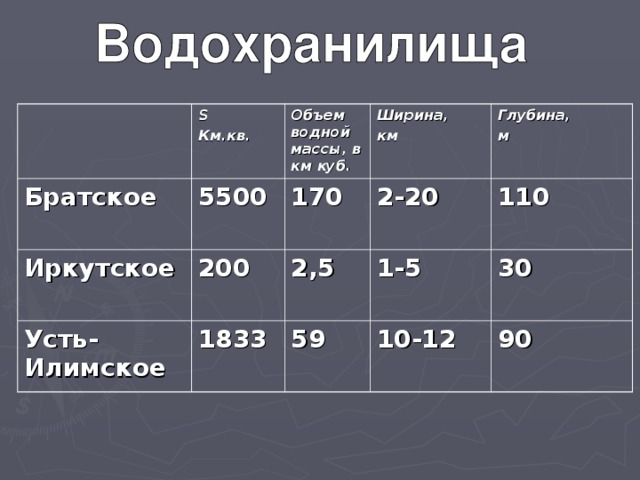 Гидроэнергетические ресурсы Иркутской области определяются в 23 млн. квт., что составляет 10.4 % от их запасов в России. В Восточно-Сибирском экономическом районе на долю области приходится 20% водных ресурсов. По удельной насыщенности или территории Иркутская обл. занимает высокое место в этом районе на 1 кв. км. Приходится 263.0 тыс. квт (в Красноярском 175.5 тыс. квт.). Благоприятным для гидроэнергетического использования данным выделяется р.Ангара