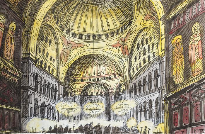 По древней легенде, князь отправил посольство из Киева в Константинополь — столицу могущественной Византийской империи. Русские послы побывали под сводами громадного собора святой Софии. Священники повсюду зажгли свечи и совершили богослужение с такой пышностью и торжественностью, что поразили послов. Те вернулись к Владимиру и рассказали об увиденном с похвалой.