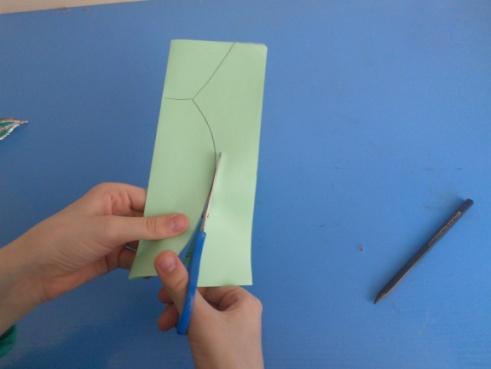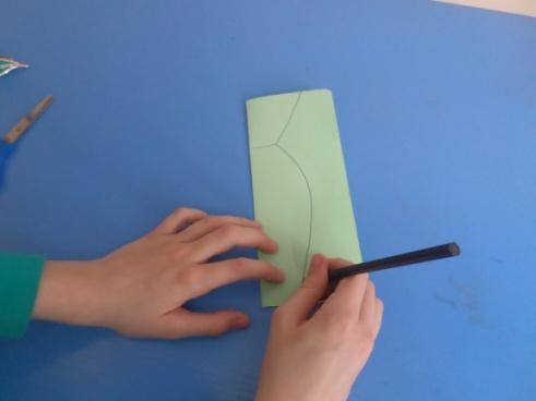 Подрисовываем стебли. Вырезаем (без наброска, складывая небольшой кусочек цветной бумаги зелёного цвета. Подклеиваем листики.