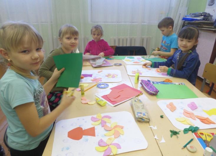 (часть ребят окрашивает листы синими пузырями, другая часть - фиолетовыми или жёлтыми, по окончании работы одним цветом меняются стаканчиками)
