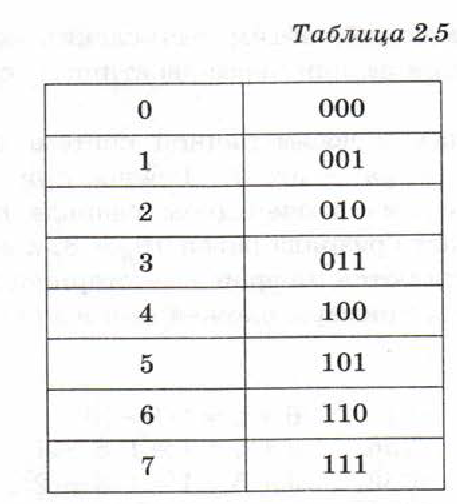 1) Перевести значение каждой цифры (отдельно) в двоичную систему. Вы это делать уже умеете, но в целях экономии времени мы будем работать с таблицей 2.5. Она есть у вас в рабочих листах и на партах.