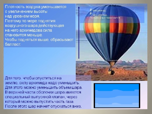 - Для воздухоплавания вначале использовали воздушные шары,которые наполняли нагретым воздухом. Сейчас их чаще наполняют водородом или гелием .Для того,чтобы шар поднялся в воздух,необходимо,чтобы сила Архимеда ,действующая на шар,была больше силы тяжести.По мере поднятия шара выталкивающая сила,действующая на него,…..,потому что плотность верхних слоев атмосферы меньше ,чем у поверхности земли.Для спуска шара из его оболочки при помощи специального клапана выпускают часть газа.