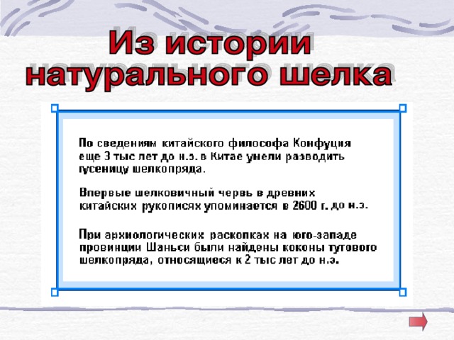 Шёлк - натуральная текстильная нить животного происхождения, продукт выделения шёлкоотделительных желёз гусениц шелкопрядов при завивке коконов.