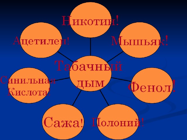 - Никотин – это яд, который содержится в табаке и вызывает привыкание. Он обладает отравляющим действием. Поражает нервную систему. Человек становится возбужденным или заторможенным. Влияет на работу сердца. Он легко проникает в кровь, накапливается во внутренних органах и постепенно разрушает их. От курения желтеют зубы, появляется дурной запах во рту, затрудняется работа сердца, замедляется рост, кожа становится желтой, под глазами черные круги, рано появляются морщины. Ребята, которые курят – быстро утомляются, у них слабая память, плохое внимание. Курильщика ждут болезни органов дыхания: астма, туберкулёз.