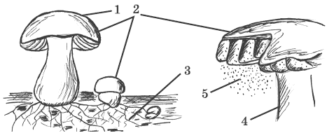 Задание №2. Используя рисунок шляпочного гриба, опишите его строение. Какими цифрами обозначена грибница и плодовое тело. Как размножаются грибы.