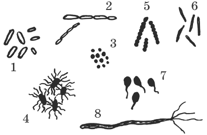 Задание №3. Перечислите формы бактериальных клеток, используя рисунок. Какие из приведенных бактериальных клеток на рисунке можно отнести к подвижным и неподвижным формам? Охарактеризуйте формы питания бактерий.
