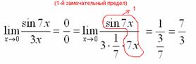 .В подобных случаях первый замечательный предел нам нужно организовать самостоятельно, используя искусственный прием. Ход рассуждений может быть таким: «под синусом 7х, значит, в знаменателе тоже нужно получить 7х».