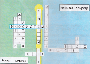 -Давайте посмотрим на кроссворд. Здесь представлены компоненты экосистемы, они делятся на живую и неживую природу. Давайте вспомним эти компоненты.