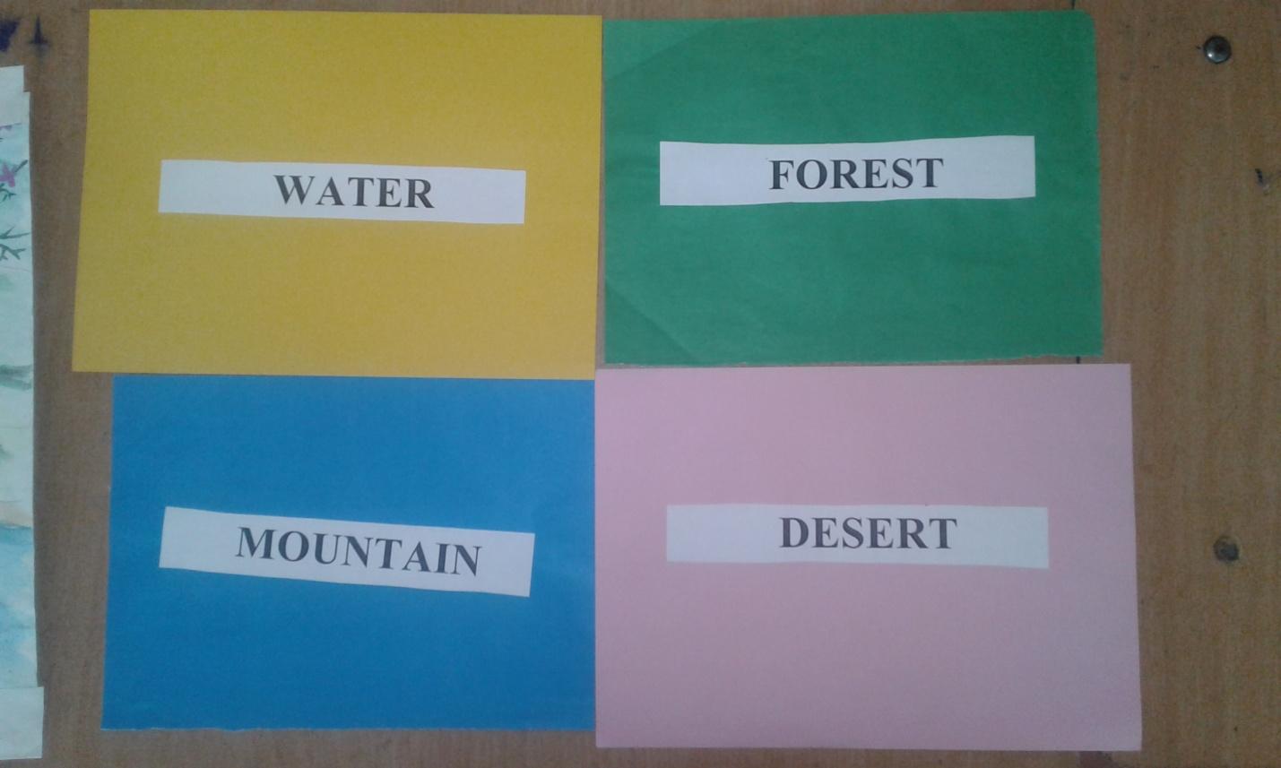 At the end of the lesson teacher gives some questions in order debriefing new theme and pupils supported with A4 papers with words water, forest, mountain and desert. According to teacher’s questions, pupils should show these papers.