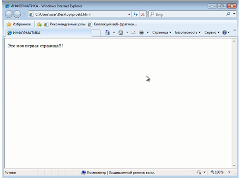 Далее откроем созданный документ в браузере. В контекстном меню выберем команду, открыть с помощью браузера Internet Explorer. Текст «Это моя первая web-страница!!!» отображается на странице. Обратите внимание, где располагается заголовок окна.