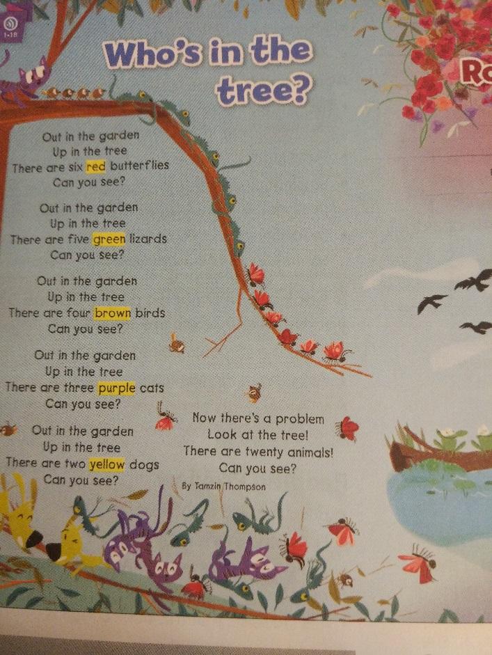 | Предлагаются вопросы по содержанию текстов.. Who’s in the tree? What is red? What colors do you like?. 1 text. Where are animals? |