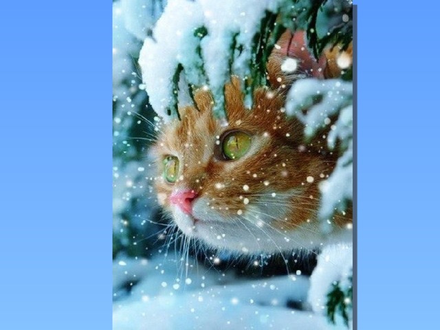 - Снежок изрезан лыжами, Как мел, скрипуч и сух. И ловит кошка рыжая Веселых белых мух.