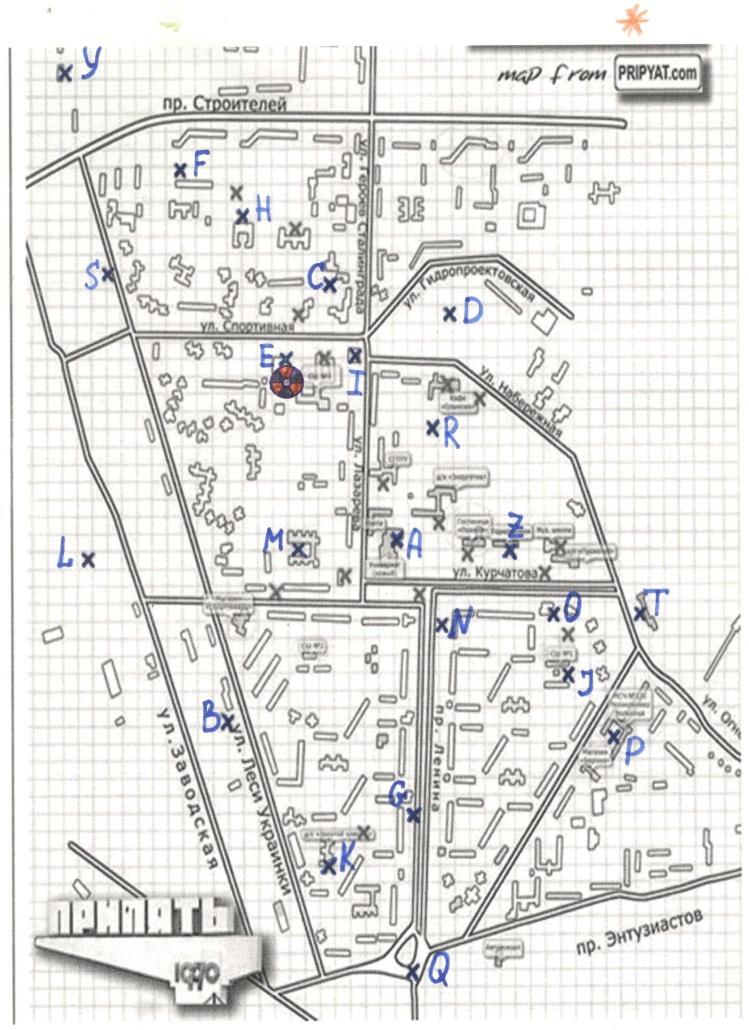 Перед Вами карта города Припять. (масштаб 1:100000) В радиусе 6,5 км от места заражения (точка А) найти все здания, отмеченные крестиком. Полученные буквы выпишите в алфавитном порядке. Данная последовательность будет ключом к следующему заданию. Перед Вами карта города Припять. (масштаб 1:100000) В радиусе 8 км от места заражения (точка Е) найти все здания, отмеченные крестиком. Полученные буквы выпишите в алфавитном порядке. Данная последовательность будет ключом к следующему заданию.