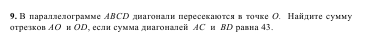 1. Диагональ BD параллелограмма ABCD образует с его сторонами углы, равные 65° и 50°. Найдите меньший угол параллелограмма.
