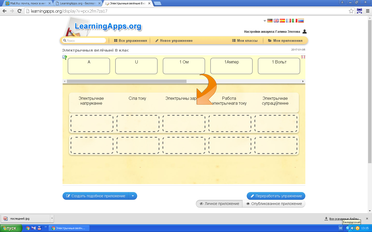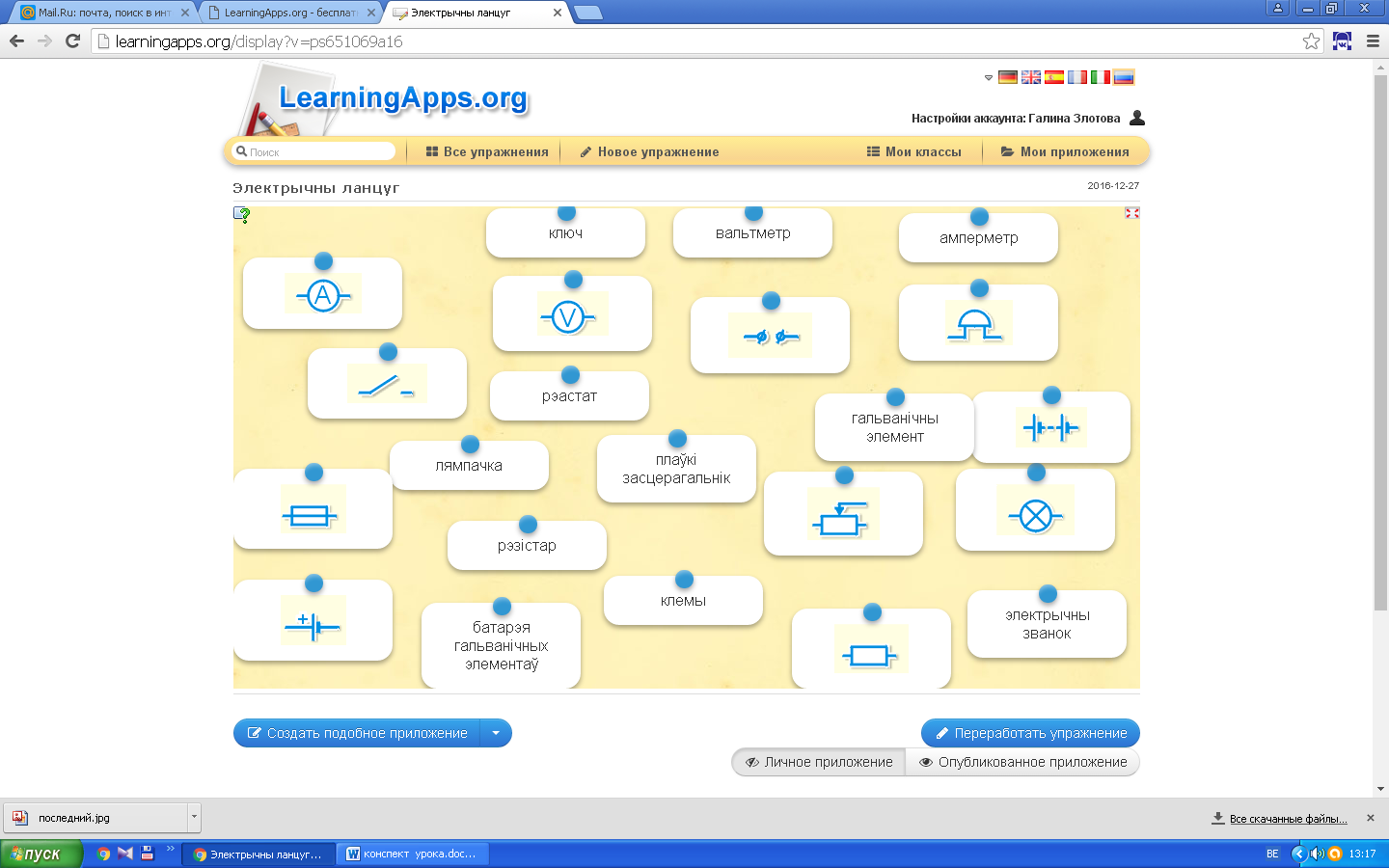 | 1. Прапануе заданні на інтэрактыўнай дошцы: -знайсці адпаведнасць паміж умоўнымі абазначэннямі і элементамі электрычнага ланцуга; -знайсці адпаведнасць паміж фізічнымі велічынямі і адзінкамі вымярэння; 2.Прапануе адказы 3.Стварае праблемную сітуацыю і прапануе вучням сфармуляваць асабістыя навучальныя і развіваючыя мэты.
